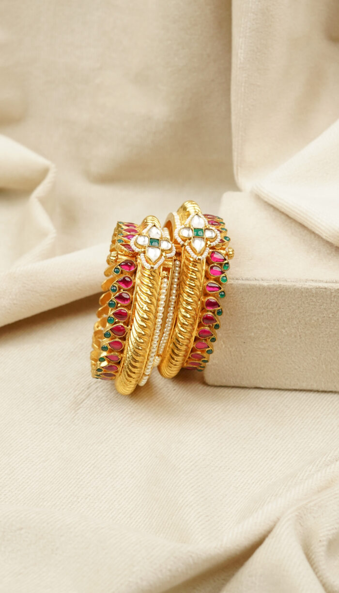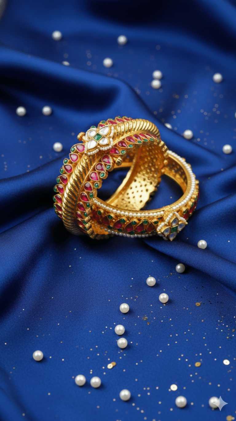 A masterpiece of colour and craftsmanship, this ruby-green kundan bangle is perfect for weddings and festivals. The stonework reflects timeless Indian heritage and elegance.