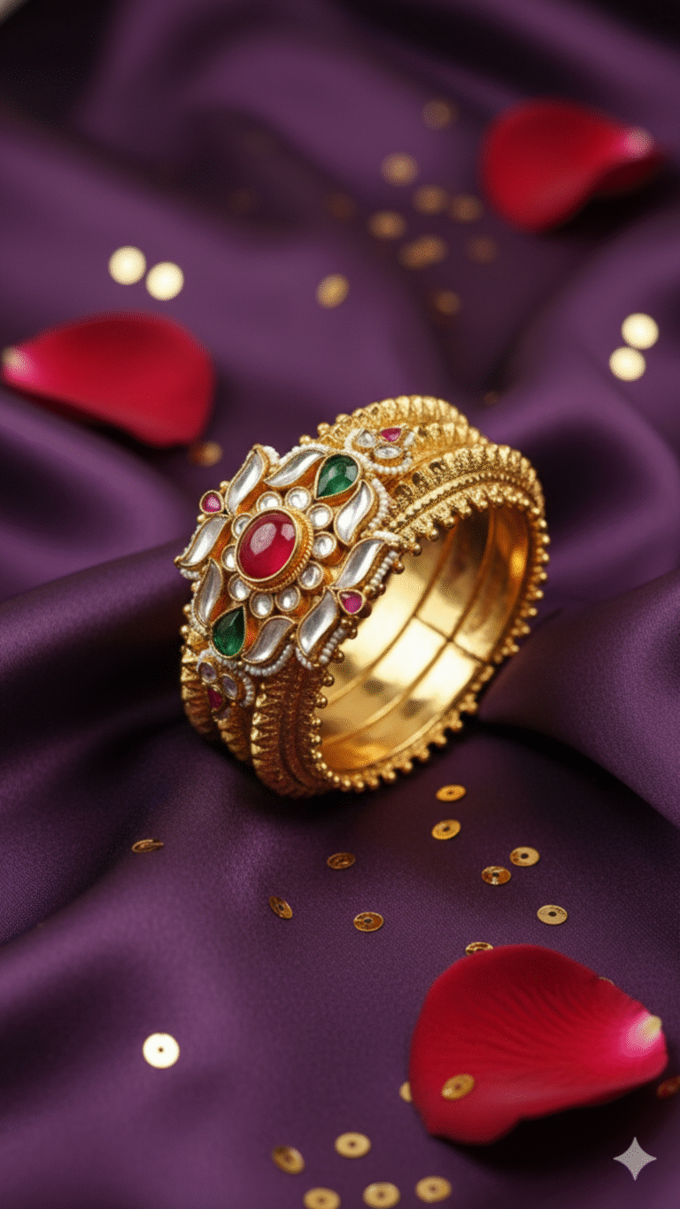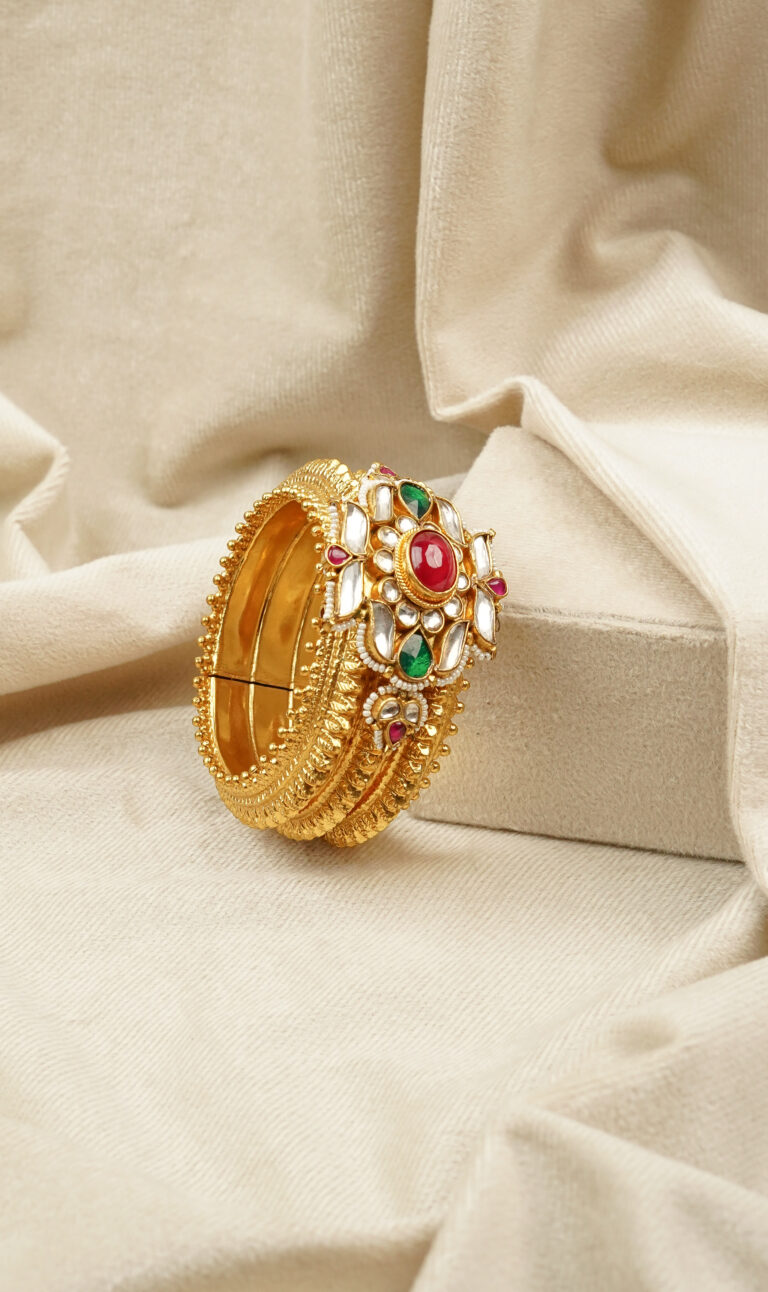Designed for the queen in you, this floral kundan kada brings regal splendour to your jewellery box. Its detailed handwork and antique glow make it ideal for bridal and festive occasions.