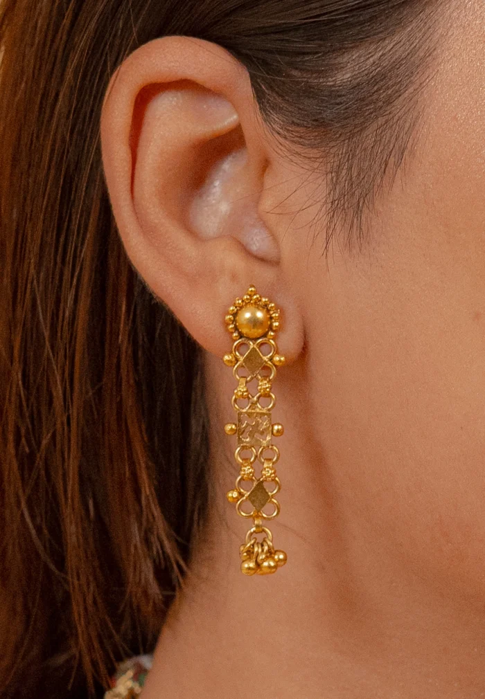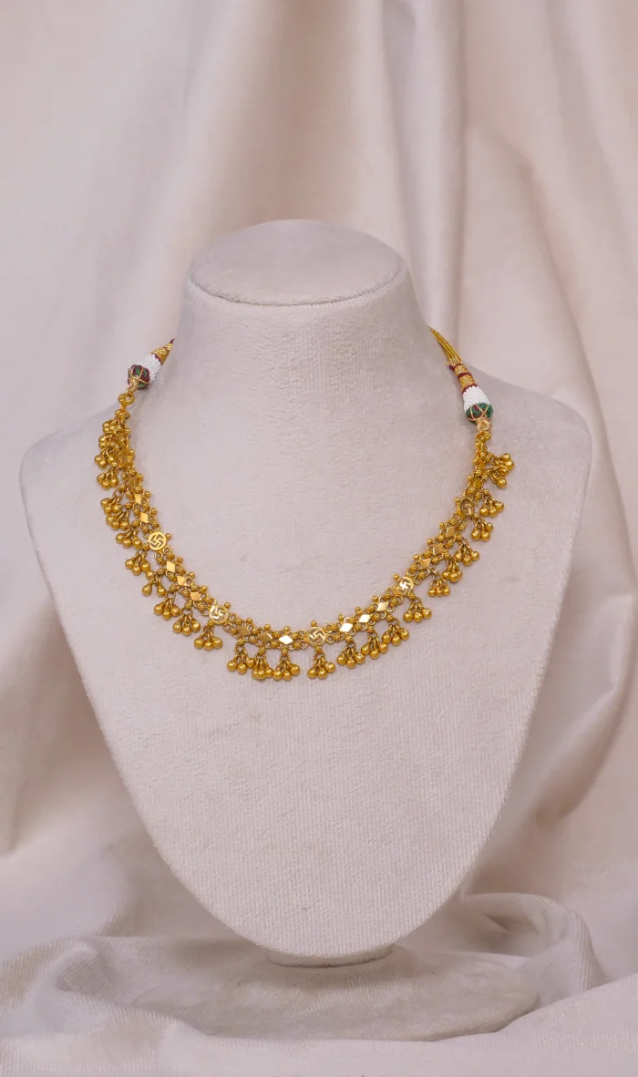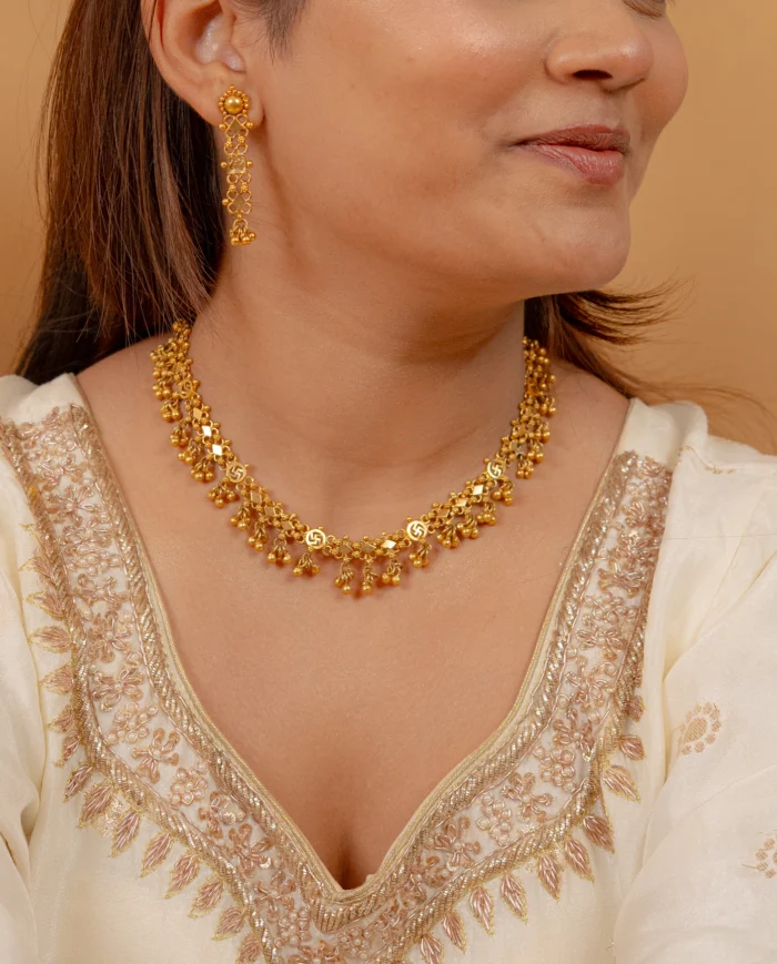 A delicate necklace set with fine golden chain work and soft hanging beads all along the bottom. The design feels light and graceful, perfect for simple sarees or daily festive wear. The earrings match the necklace beautifully with a long hanging pattern that moves gently. This piece is lovingly handcrafted and brings a soft, traditional charm to your look.