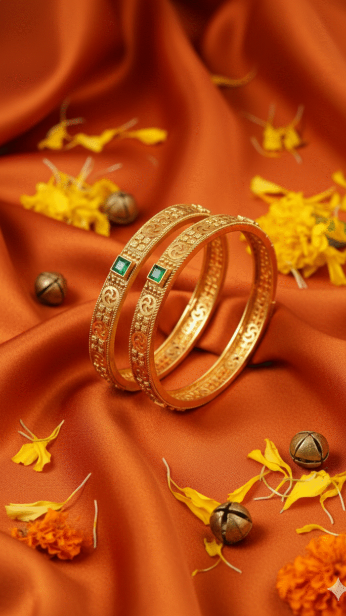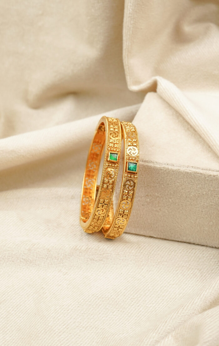 This emerald Swastik bangle combines divine symbolism with modern artistry. Handcrafted in gold-forming style, it reflects prosperity and grace, perfect for gifting or festive wear.