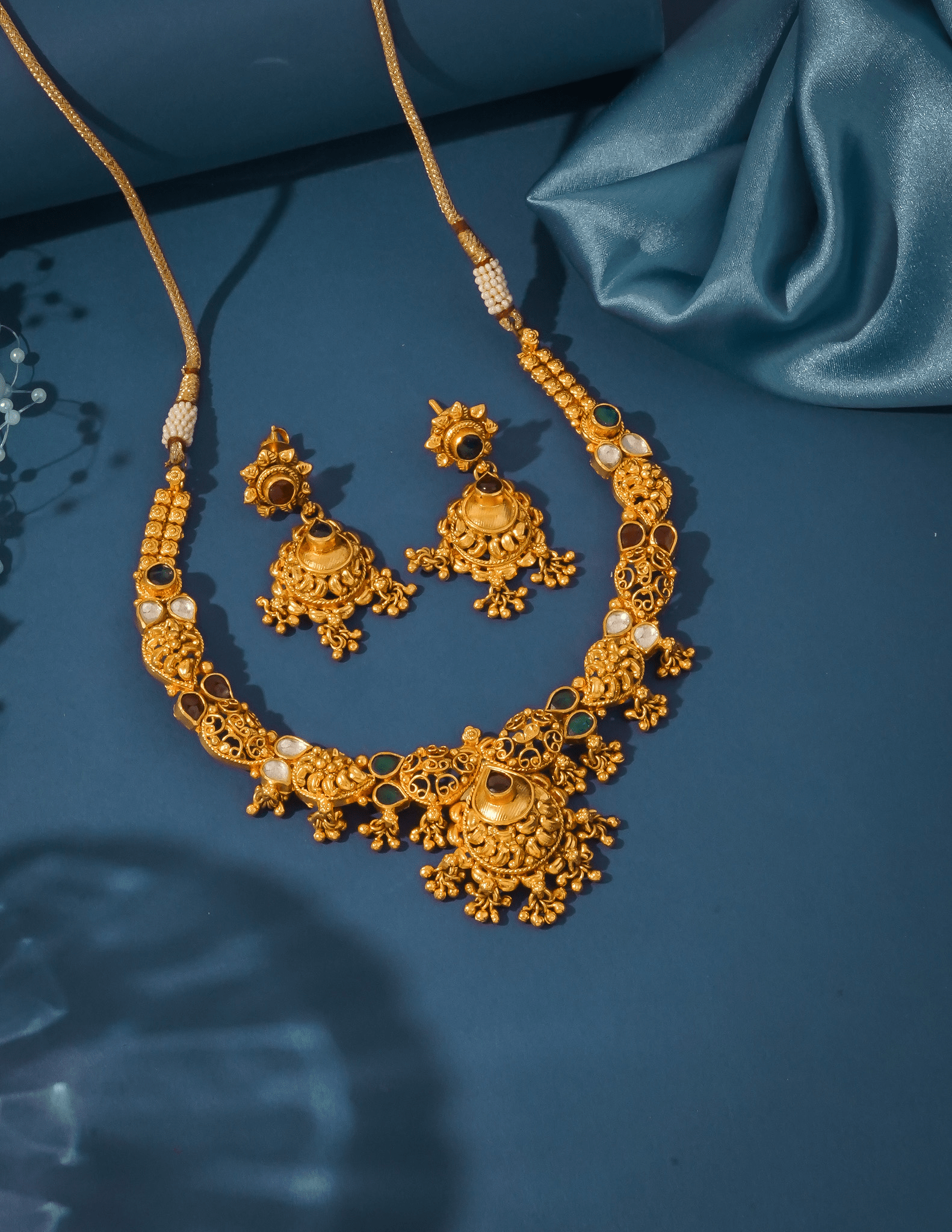 This necklace set features a traditional floral-inspired pendant in the center, highlighted with green, maroon, and white stones. The sides are designed with matching motifs and hanging beads that move softly with every step. The earrings carry the same design flow, with small floral tops and pear-shaped drops. A perfect match for wedding functions, temple visits, or festive occasions that call for a graceful and colourful look.