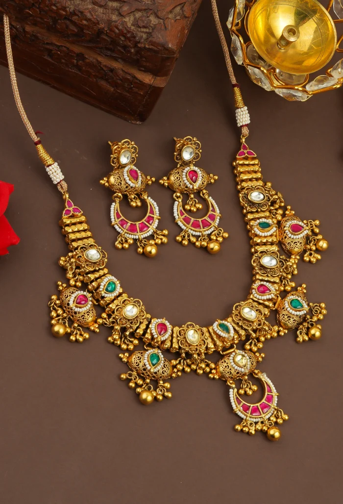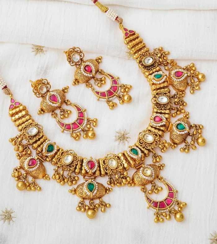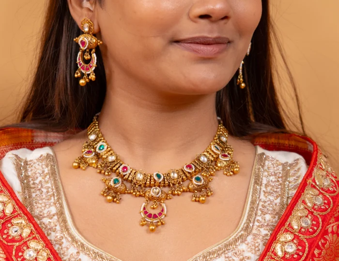 A majestic gold-forming Doodi necklace set featuring bold motifs and vibrant red, green, and white stones.Matching earrings complete the look, perfect for bridal wear and grand traditional occasions.Expertly handcrafted by real gold jewelry artisans using traditional patch chaki for authentic detailing.