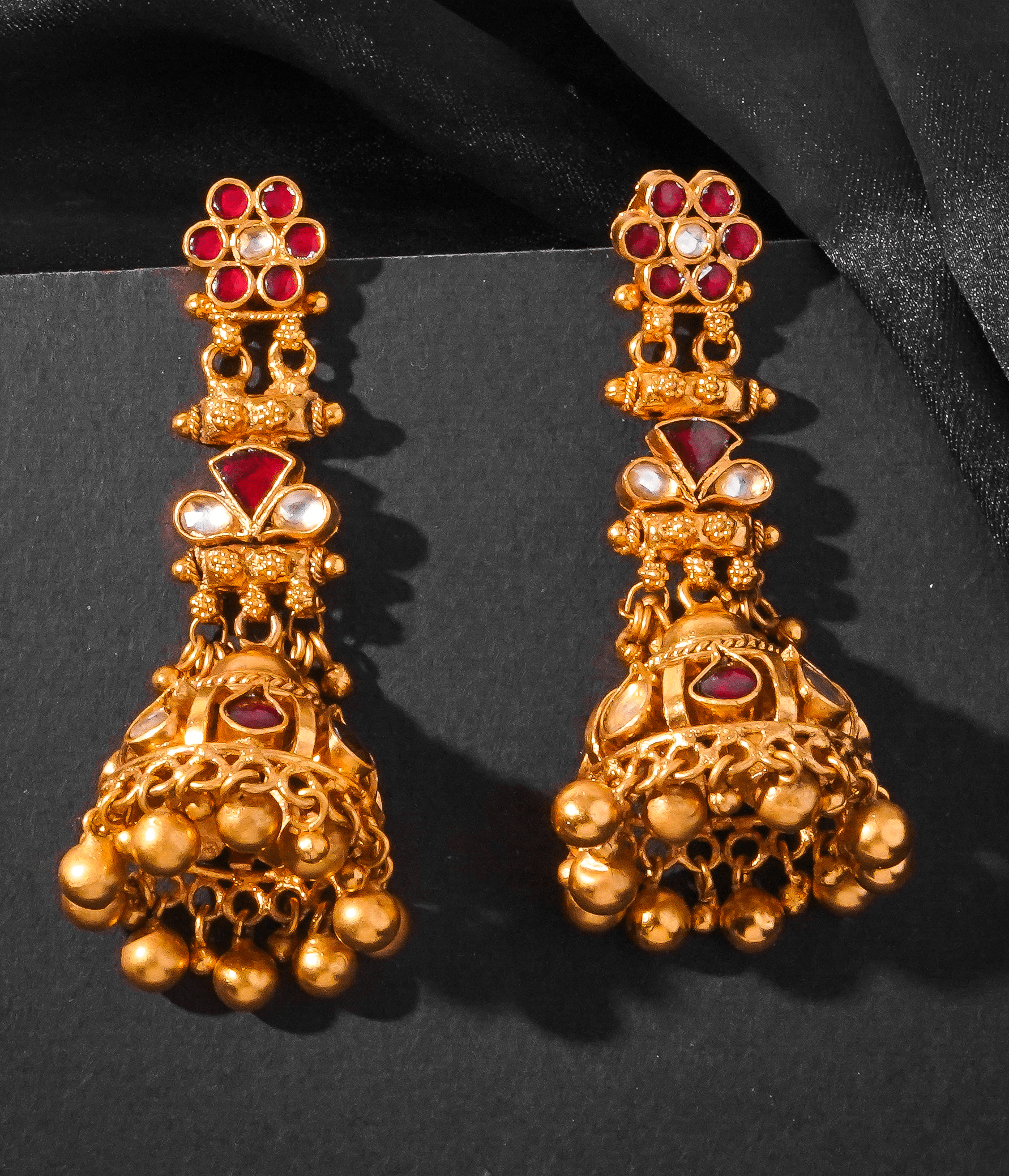 This soft and elegant necklace features small floral patterns with red stones, paired with golden bead hangings that create gentle movement. The design is light and wearable, making it ideal for smaller functions or day events. The earrings are beautifully detailed, with matching floral tops and triple-layered jhumka drops. A lovely choice for pooja, gifting, or festive looks that need a graceful touch.