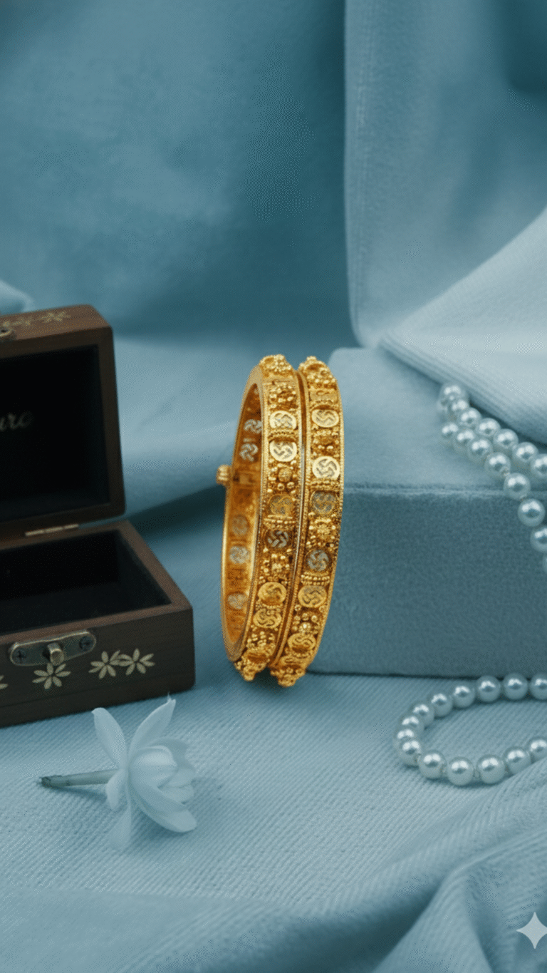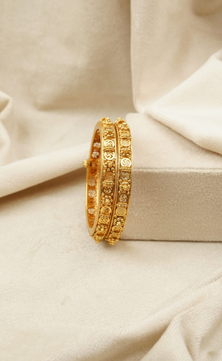 A symbol of purity and tradition, this Swastik-inspired gold-forming bangle by Dev Jewellers celebrates auspicious beginnings. Handcrafted with precision and a rich antique gold look, it pairs beautifully with sarees and festive attire.