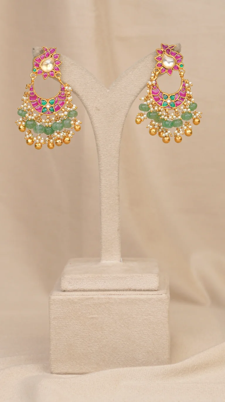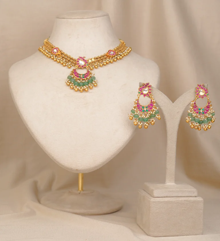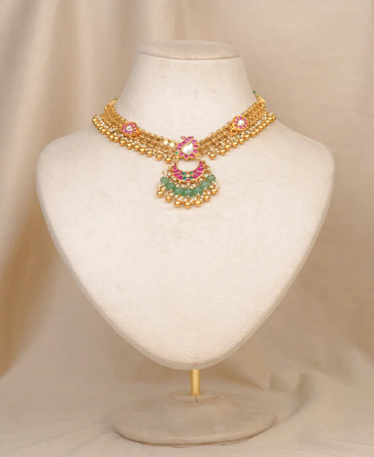 This elegant gold forming necklace set features a layered beaded design with a striking pendant. The pendant is detailed with pink kundan work, accented with green bead clusters and golden drops that add movement and festive charm. The matching earrings mirror the same artistry, completing the traditional appeal. Perfect for weddings, garba nights, and family gatherings, this piece reflects timeless Indian tradition and brings grace, beauty, and heritage to every occasion.