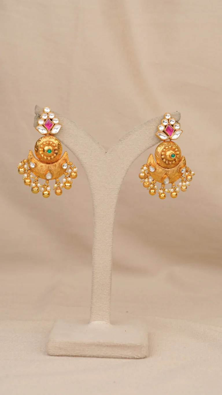 A regal pair of gold-forming earrings adorned with a striking red square stone at the top, delicate green stone detailing, and sparkling white accents. The dome-shaped design features intricate etching and is finished with clusters of pearls and gold beads, adding a traditional grandeur. Perfect for weddings, festive wear, and special occasions, these earrings exude timeless elegance.