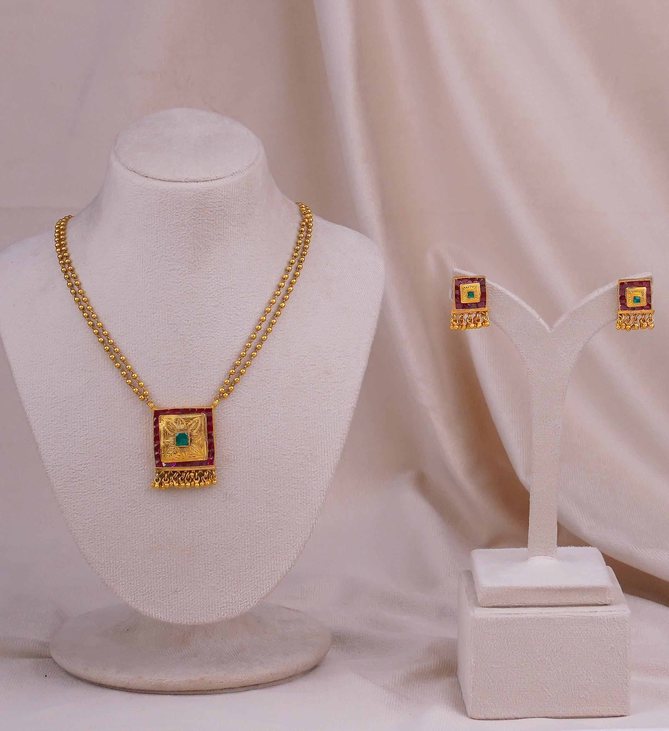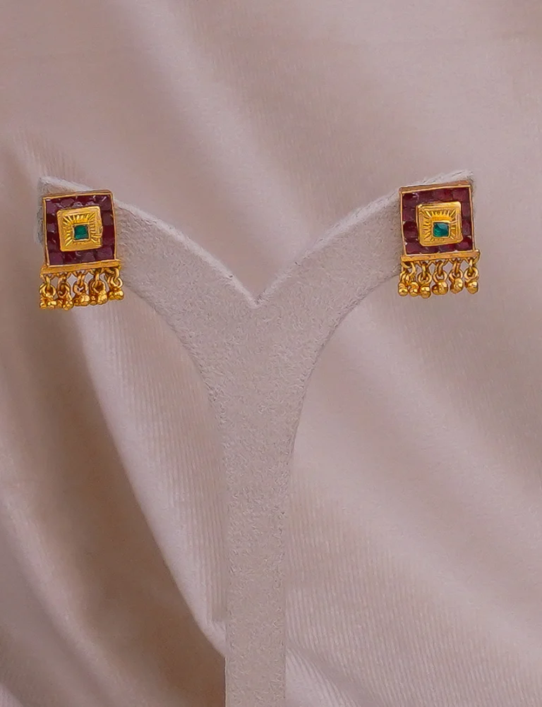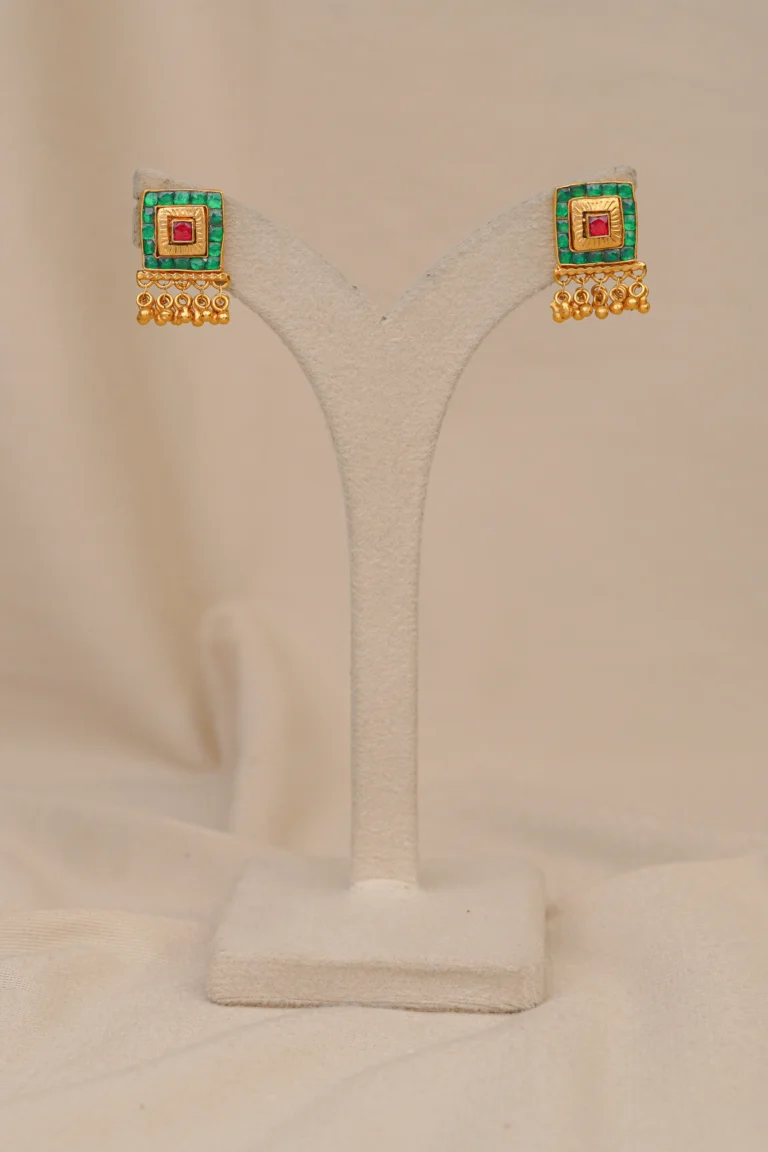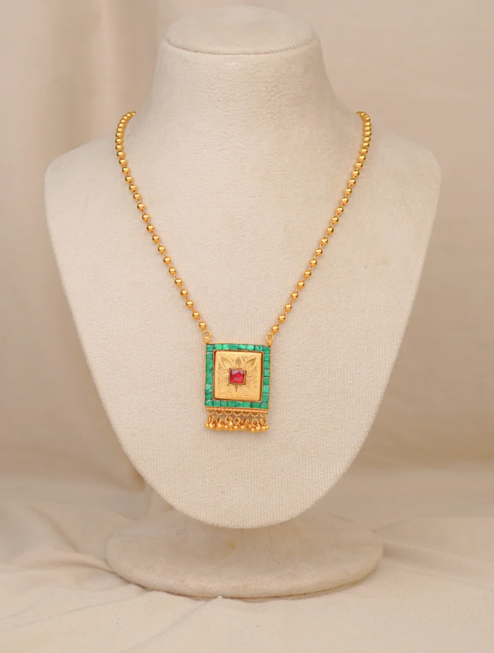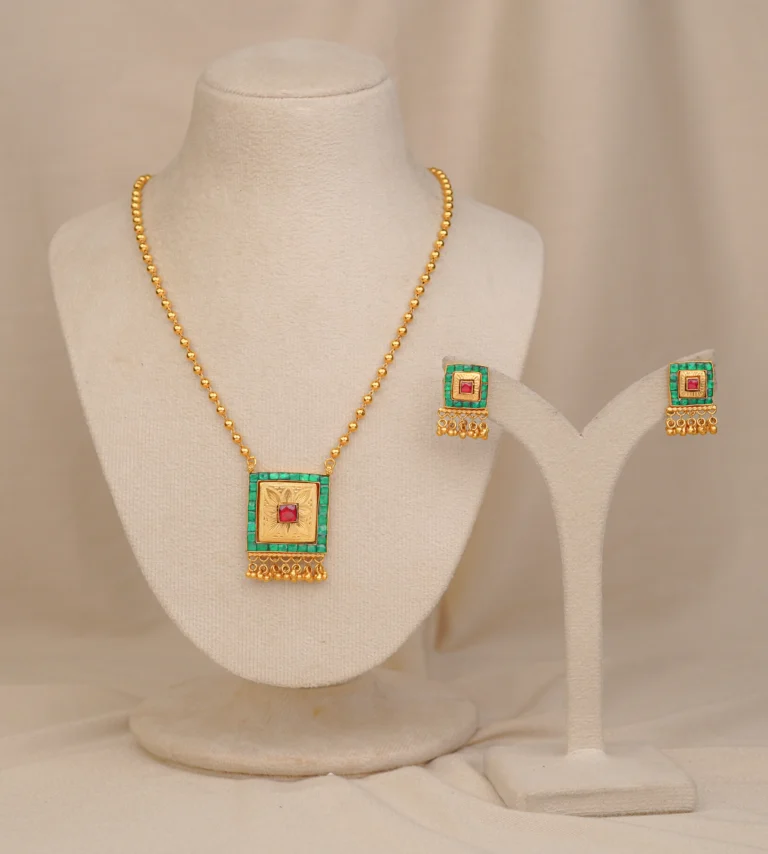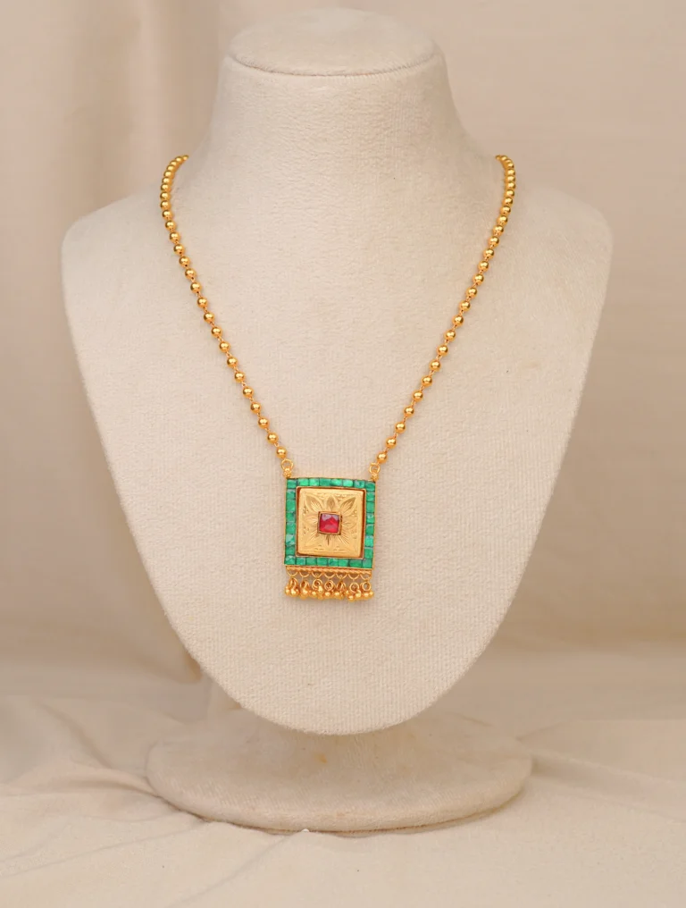 A finely crafted antique gold pendant set with a floral-inspired design, decorated with red and green stones for a vibrant traditional look. The edges are finished with delicate pearl-like drops, adding graceful movement. Matching earrings mirror the pendant’s detailing, making this set ideal for weddings, festive occasions, and poojas. Comfortable for daily wear, it will keep its shine and charm for a lifetime.