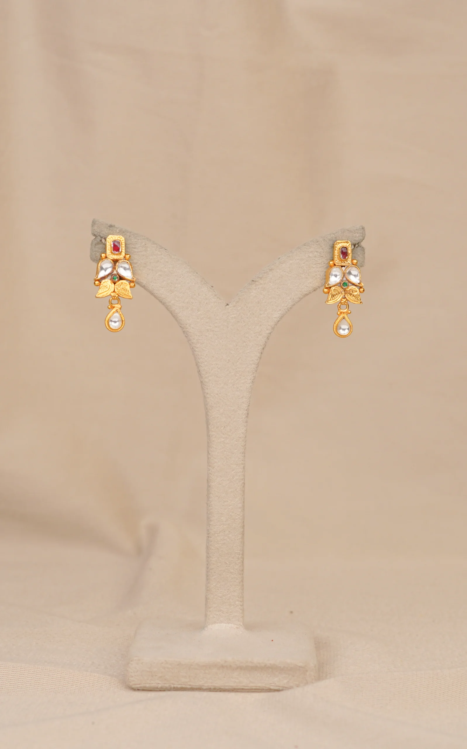 These elegant gold-plated earrings feature a rich combination of a deep red stone at the top and a teardrop-shaped green stone at the base, highlighted with delicate kundan accents. The intricate design adds a touch of heritage charm, making them perfect for festive occasions, weddings, or traditional gatherings. Lightweight and comfortable, these earrings are crafted for lifetime wear without losing their shine. Ideal for pairing with sarees, lehengas, and ethnic suits.
