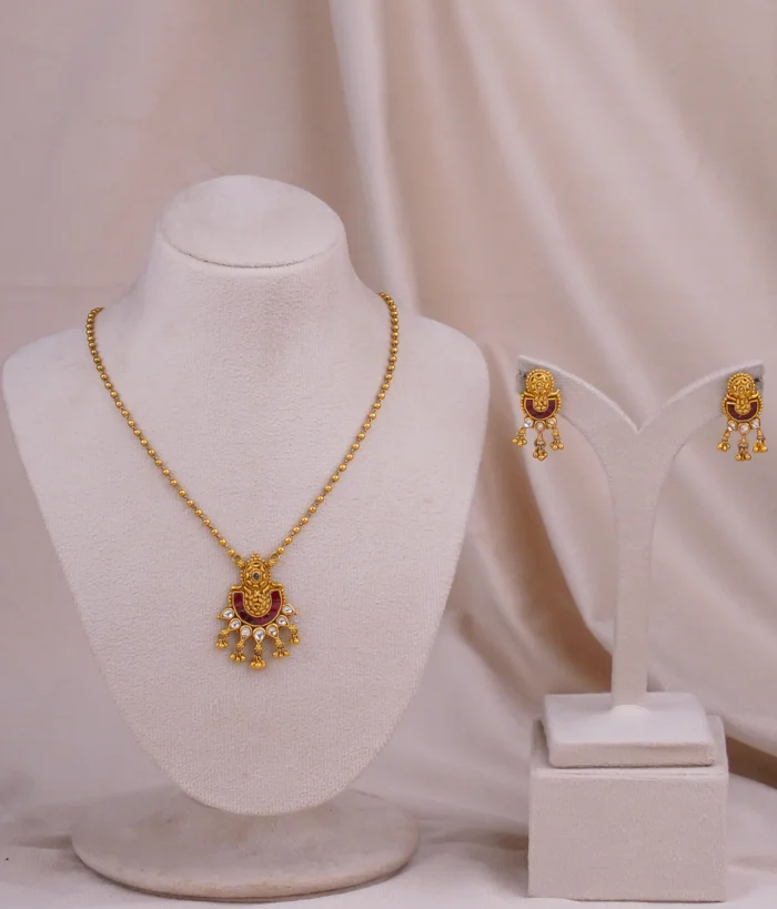 A traditional Lakshmi design necklace in rich gold tones, featuring a deep red backdrop and sparkling white stones for divine elegance. The dainty gold balls and pearl-like drops add movement and charm. Matching earrings feature the same auspicious motif, making them ideal for poojas, festivals, and everyday wear without fear of dullness. A timeless choice for those who treasure tradition in every detail.