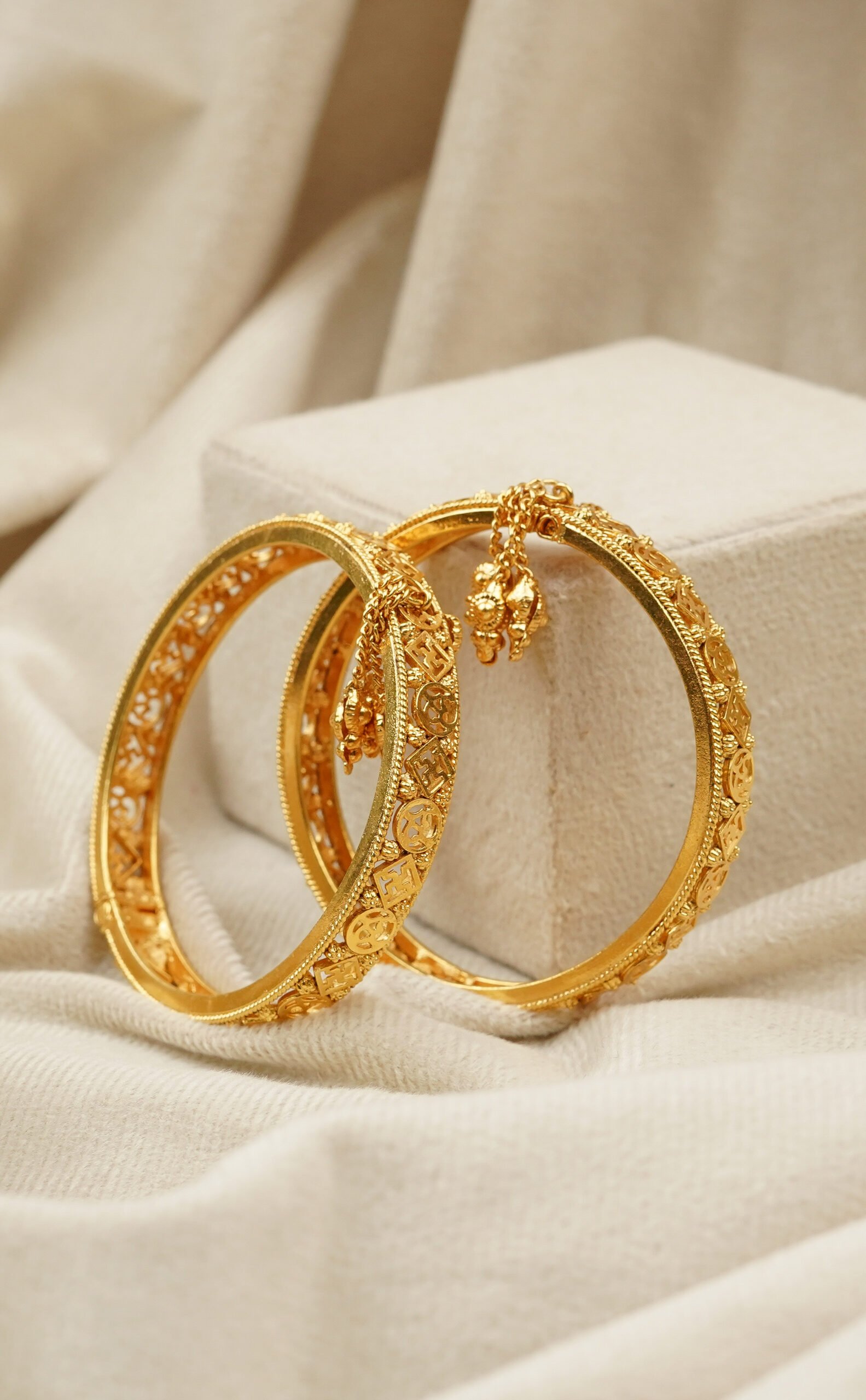 This carved gold bangle features intricate floral cutwork and soft dangling charms that add graceful movement. The deep gold shine and handcrafted finish make it perfect for weddings, festive wear, and everyday ethnic outfits. Lightweight, comfortable, and classic—ideal for completing any traditional look