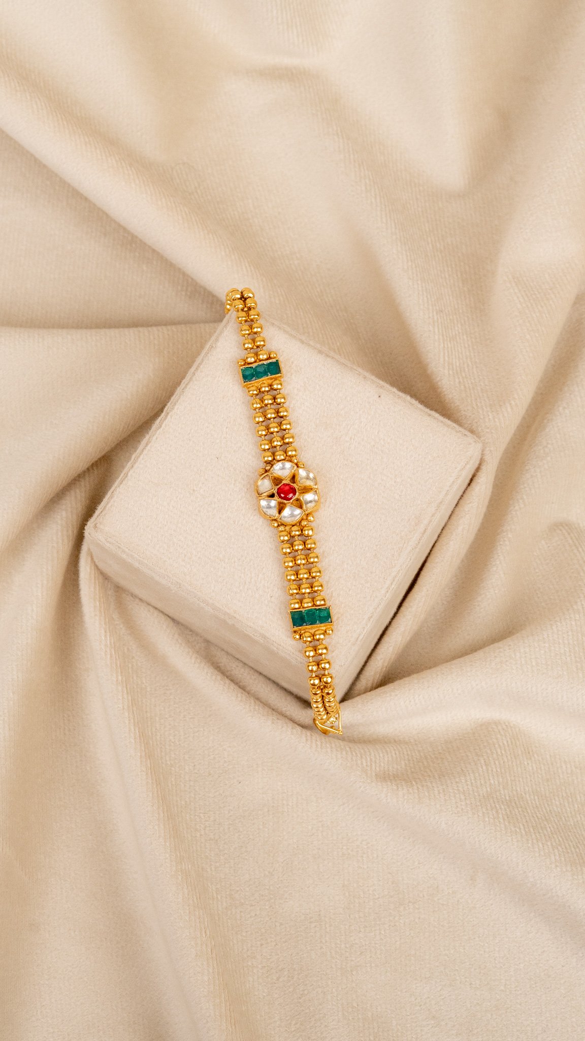 The Emerald Cluster Kundan Bracelet blends rich green hues and gold tones in floral perfection. The clustered emerald kundan stones form petals bordered by white kundans and gold beads. A smooth chain of golden links adds structure and shine. Each stone is hand-set with precision, creating a detailed, antique-inspired masterpiece that shines with natural grace and cultural richness.