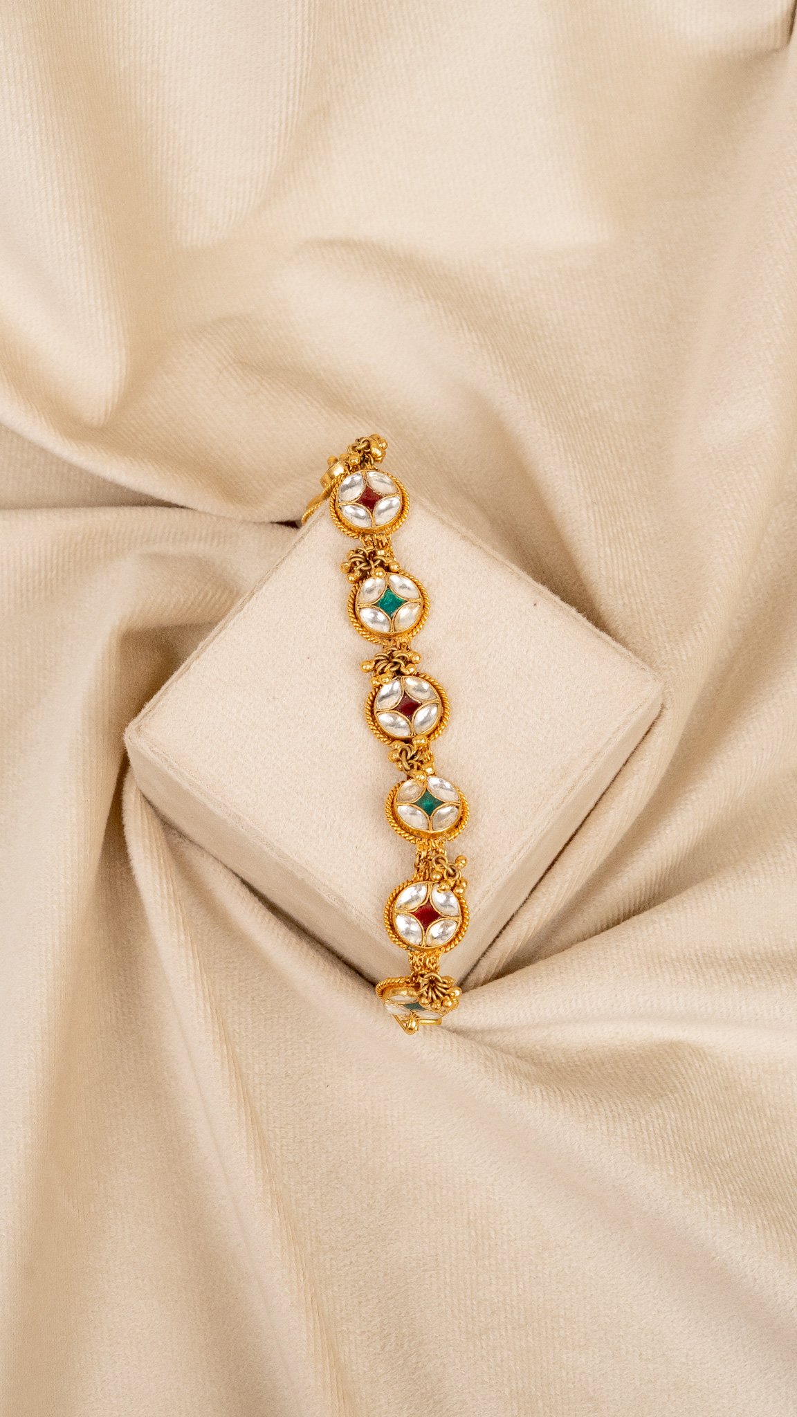 Designed for the queen in you, this floral kundan kada brings regal splendour to your jewellery box. Its detailed handwork and antique glow make it ideal for bridal and festive occasions.