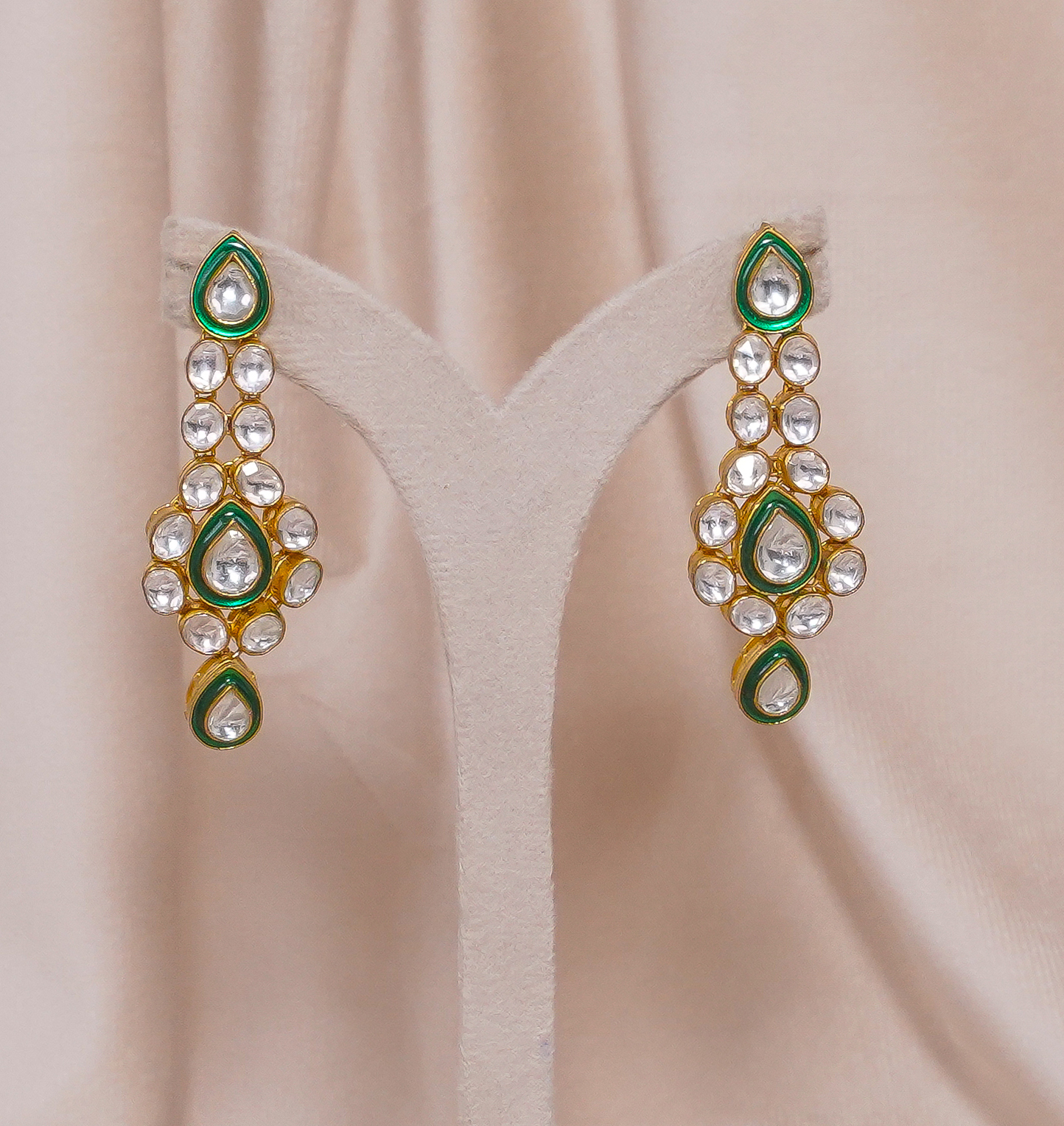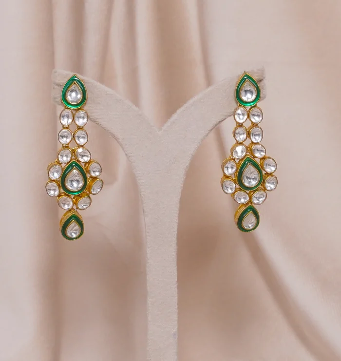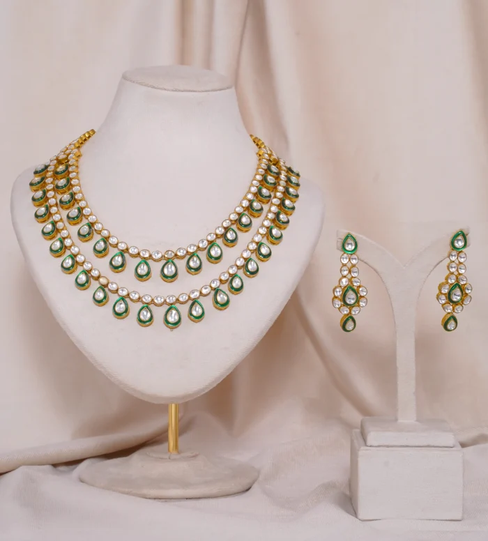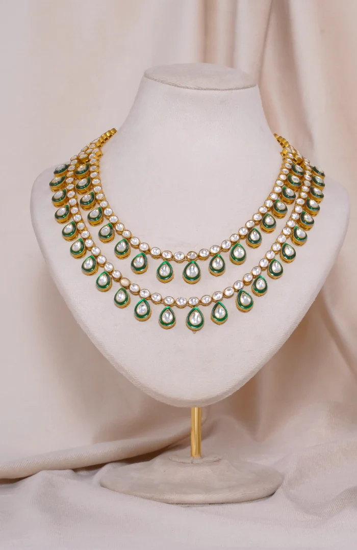 A majestic three-layer kundan necklace set, featuring alternating lines of shimmering white kundan stones and teardrop-shaped green mino enamel accents. Paired with matching long drop earrings, this set radiates regal elegance, making it perfect for weddings, grand celebrations, and royal-inspired looks. Its layered design gracefully enhances any traditional attire.