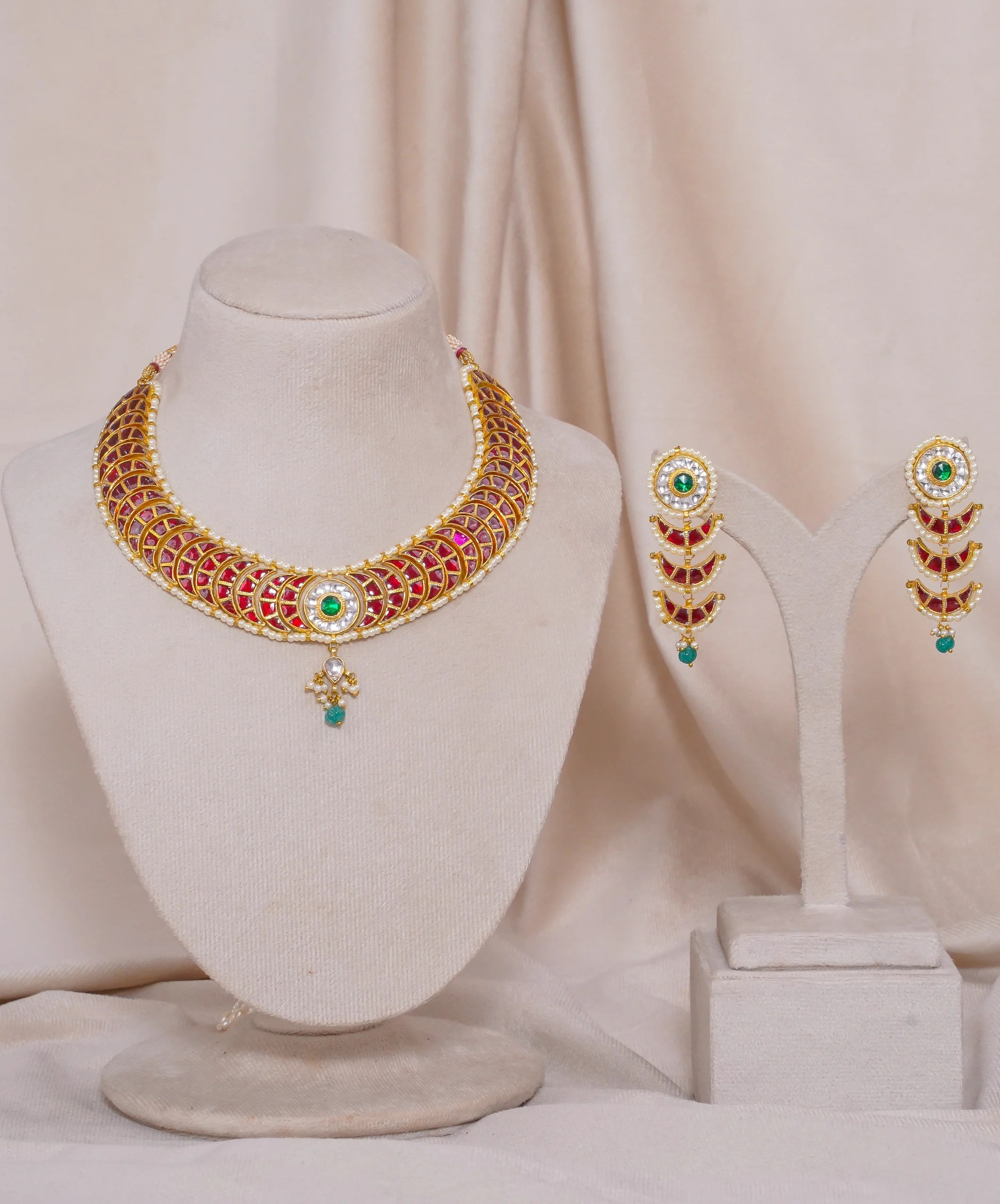 This elegant choker necklace set from Dev Jewellers features intricate Meenakari work paired with brilliant green, red, or blue stones, framed in delicate scalloped gold patterns. Sparkling white stones enhance its royal charm, while the graceful drop bead adds a touch of finesse. Paired with matching long earrings, this set is perfect for weddings, garba nights, festive poojas, and cultural celebrations. A timeless choice for women who love traditional Indian jewellery that blends rich heritage with vibrant colours.