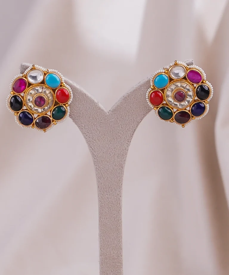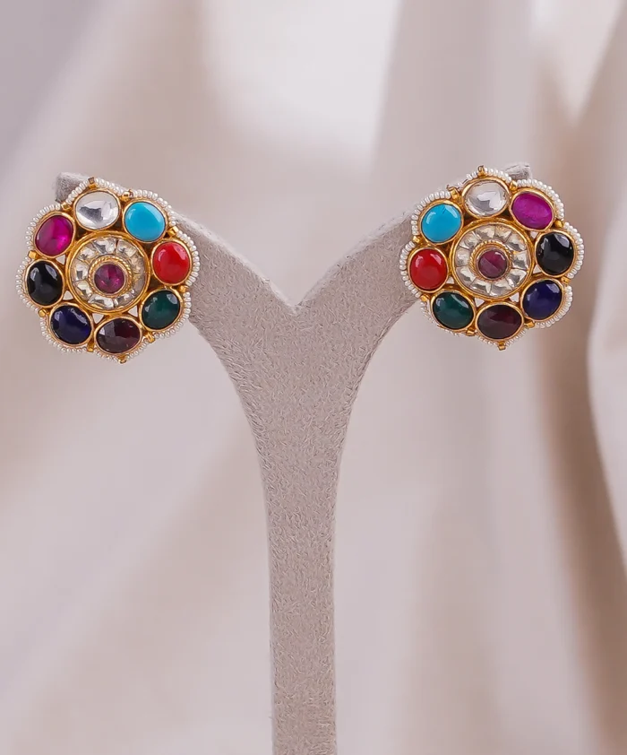 These Navratna floral stud earrings beautifully unite nine auspicious gemstones, each symbolizing prosperity, protection, and harmony. Set in a radiant golden frame, the vibrant stones — including ruby, emerald, sapphire, and turquoise — form a perfect flower around a sparkling kundan center. Ideal for poojas, festive wear, and traditional gatherings, these earrings carry timeless charm and cultural significance, making them a treasured addition to any jewellery collection.