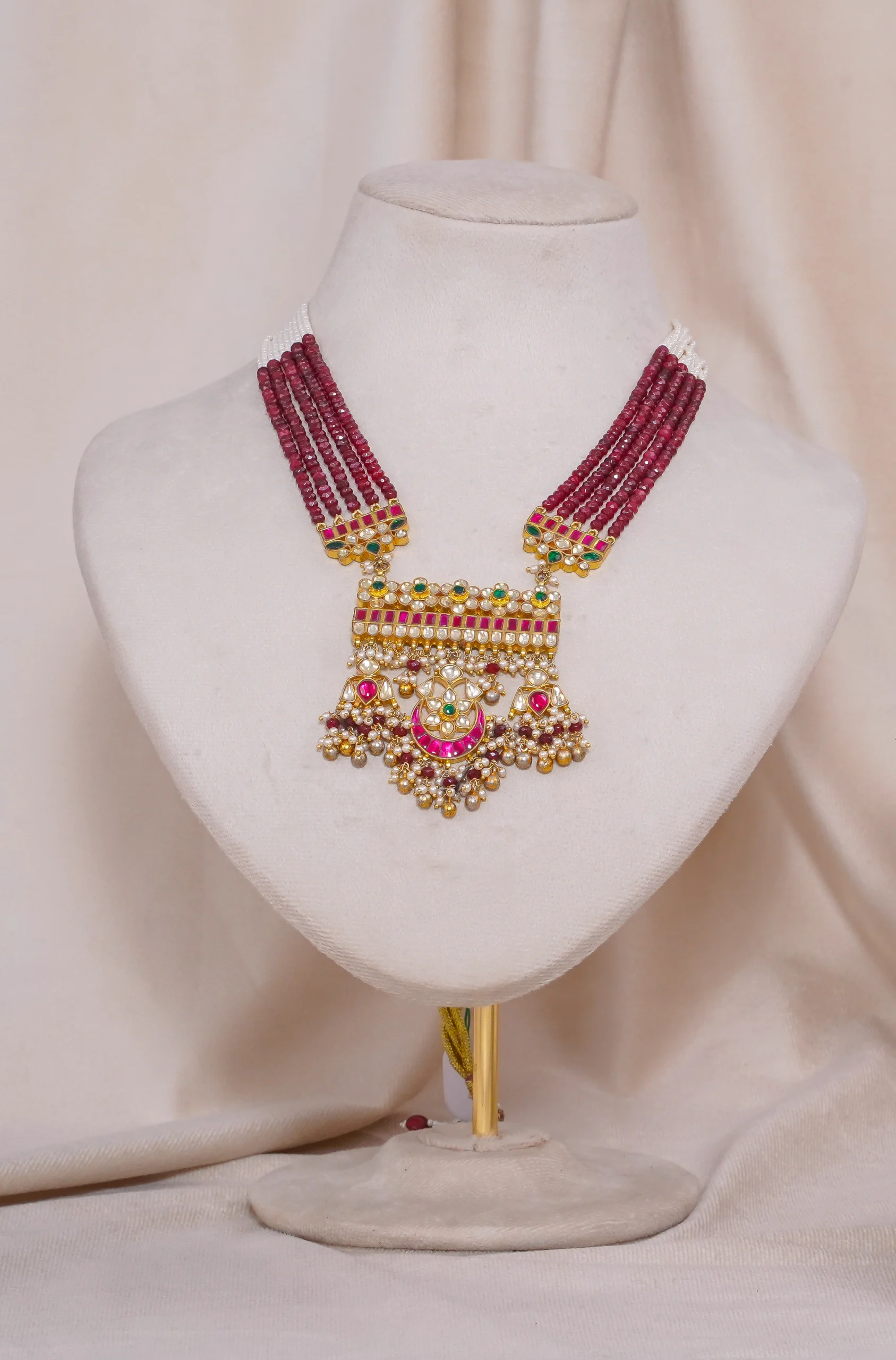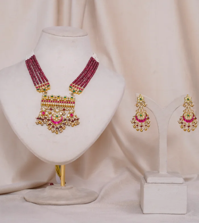 A grand statement necklace adorned with rich rani-pink beads, paired with a bold rectangular pendant showcasing intricate Kundan work, pearl accents, and delicate green detailing. The matching earrings echo the same royal design, making it a perfect pick for bridal and festive occasions.