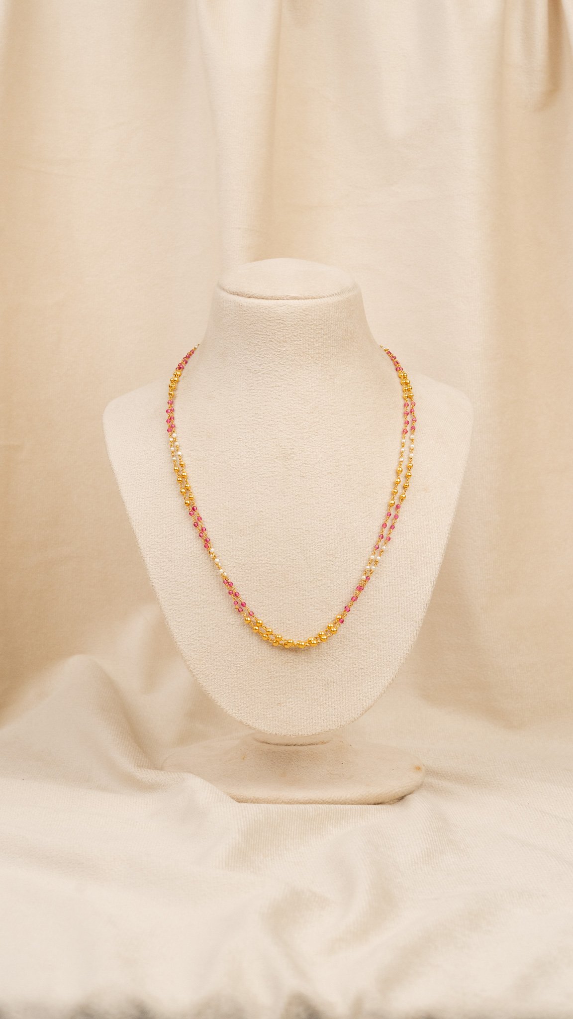 | This pearl and chain dual-layer mala brings contemporary finesse to a classic look. The combination of pearls and fine chains gives light movement and shimmer. It’s ideal for festive events, family occasions, or pairing with simple outfits for an elevated, polished finish. |