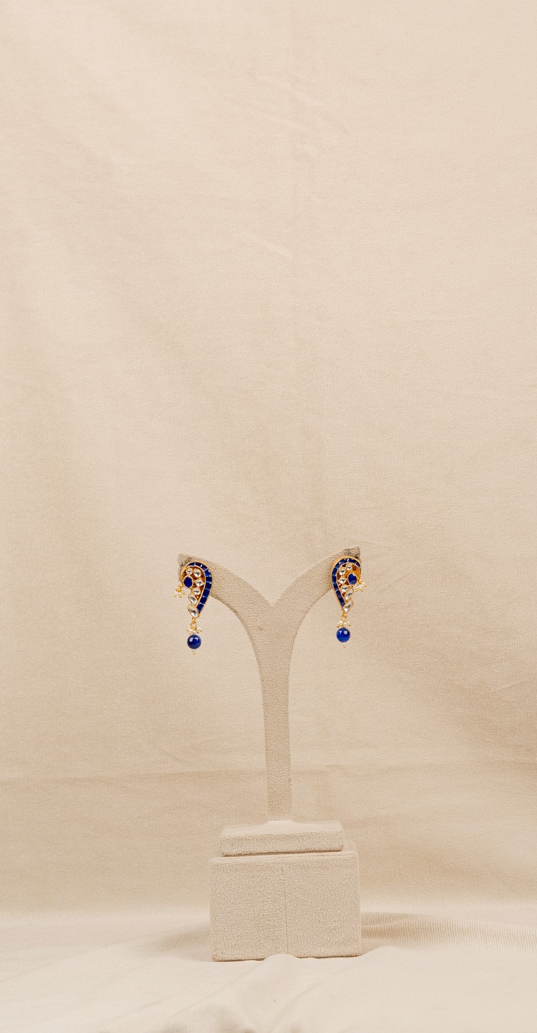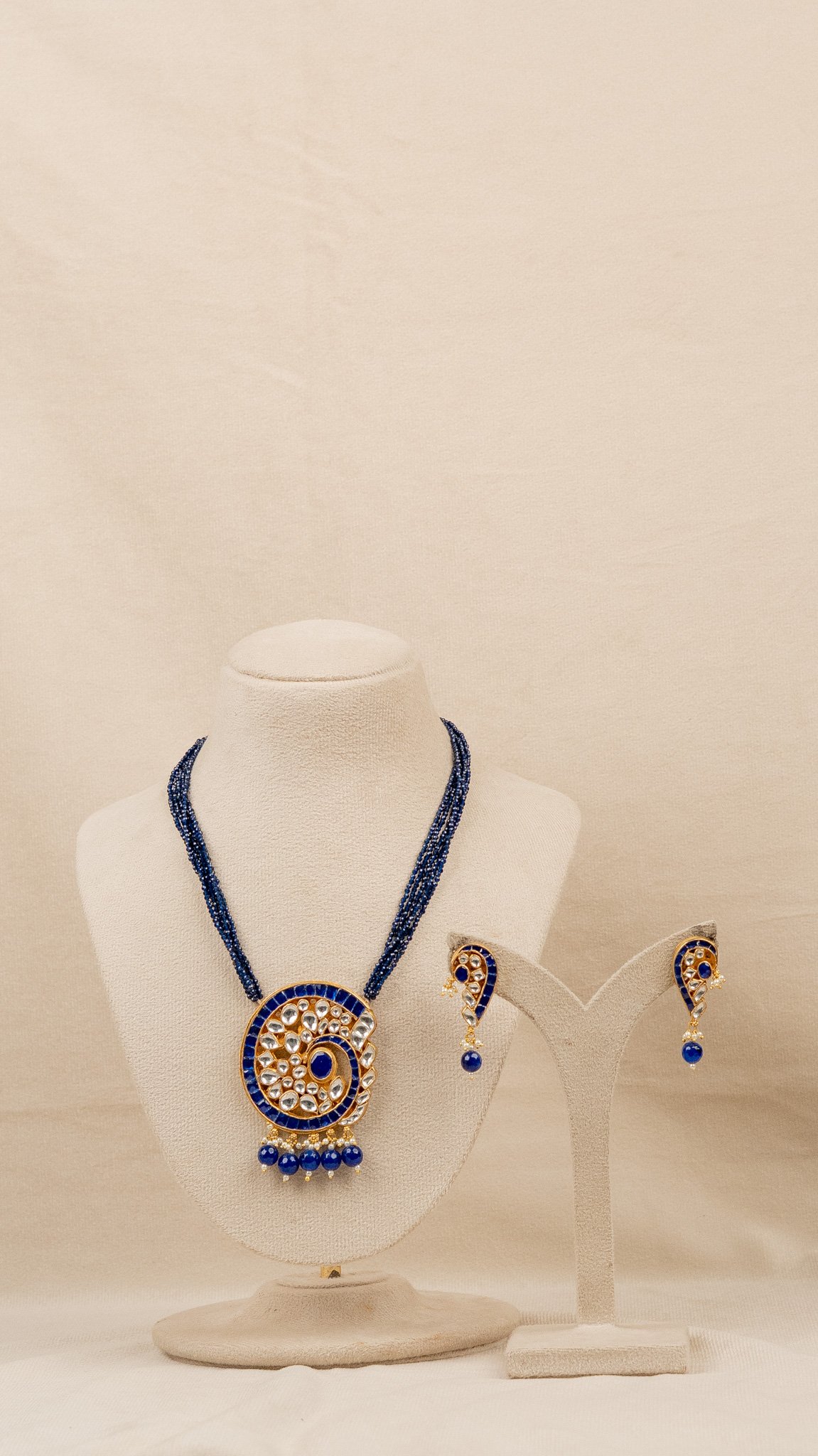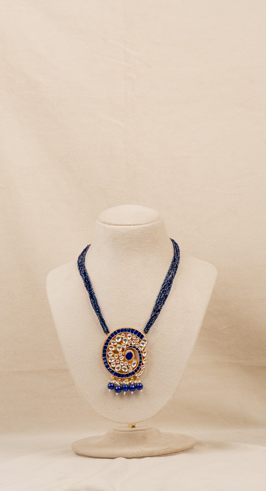 This royal blue Kundan necklace set features a bold spiral pendant adorned with shimmering stones, paired with matching earrings. The multi-layer blue beaded chain adds richness and depth, making it a perfect pick for weddings, festivals, sangeet nights, and reception looks. Its lightweight design and vibrant colours instantly elevate any ethnic outfit, from silk sarees to designer lehengas.